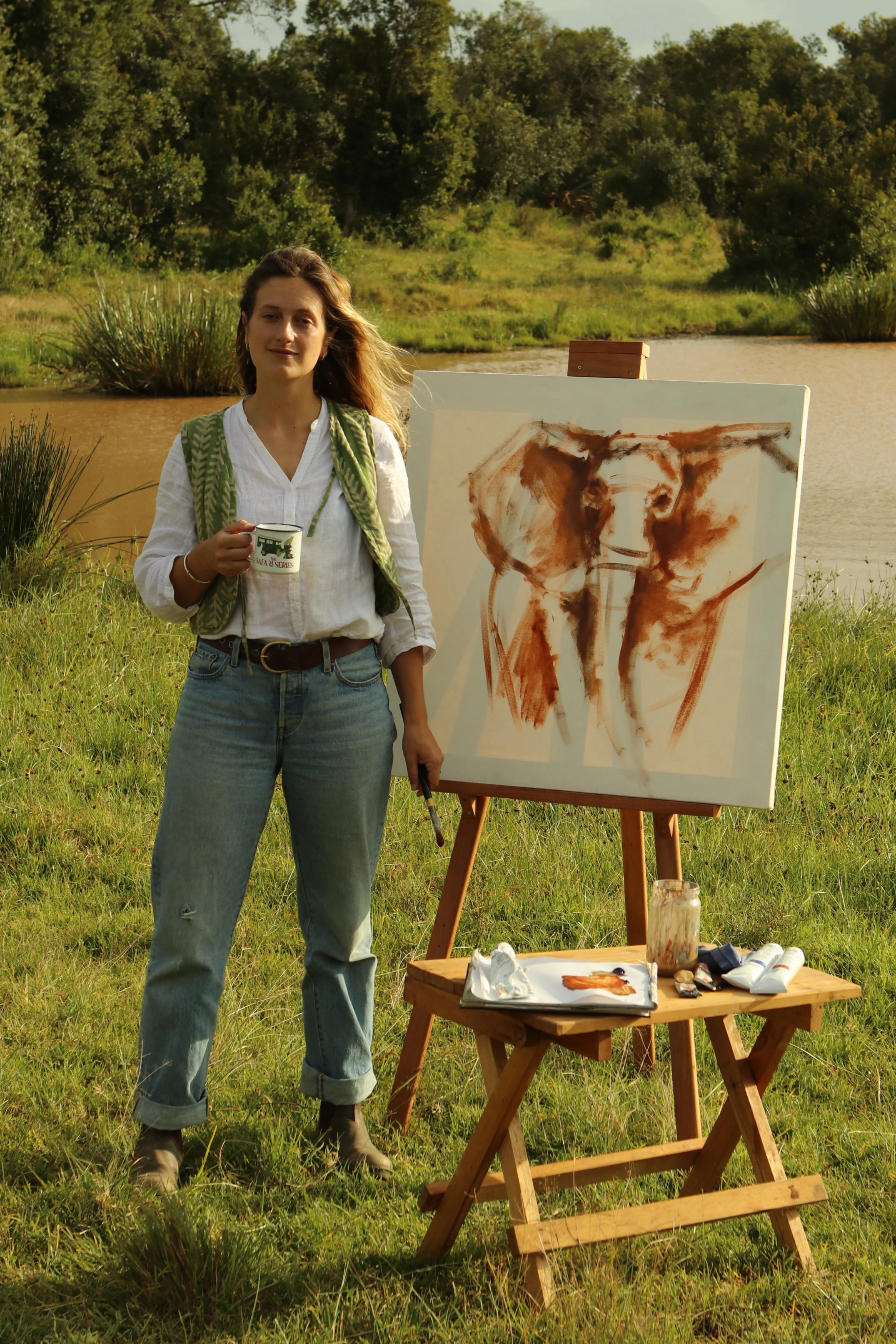 I split my time between North Devon and Southwest Germany where my partner is from. When I am not painting, my rescue dog Arwen and I do lots of hiking. My favourite place is outdoors, be it taking a cold plunge in the sea, sitting beside a fire pit, or feasting on an alfresco meal with friends.