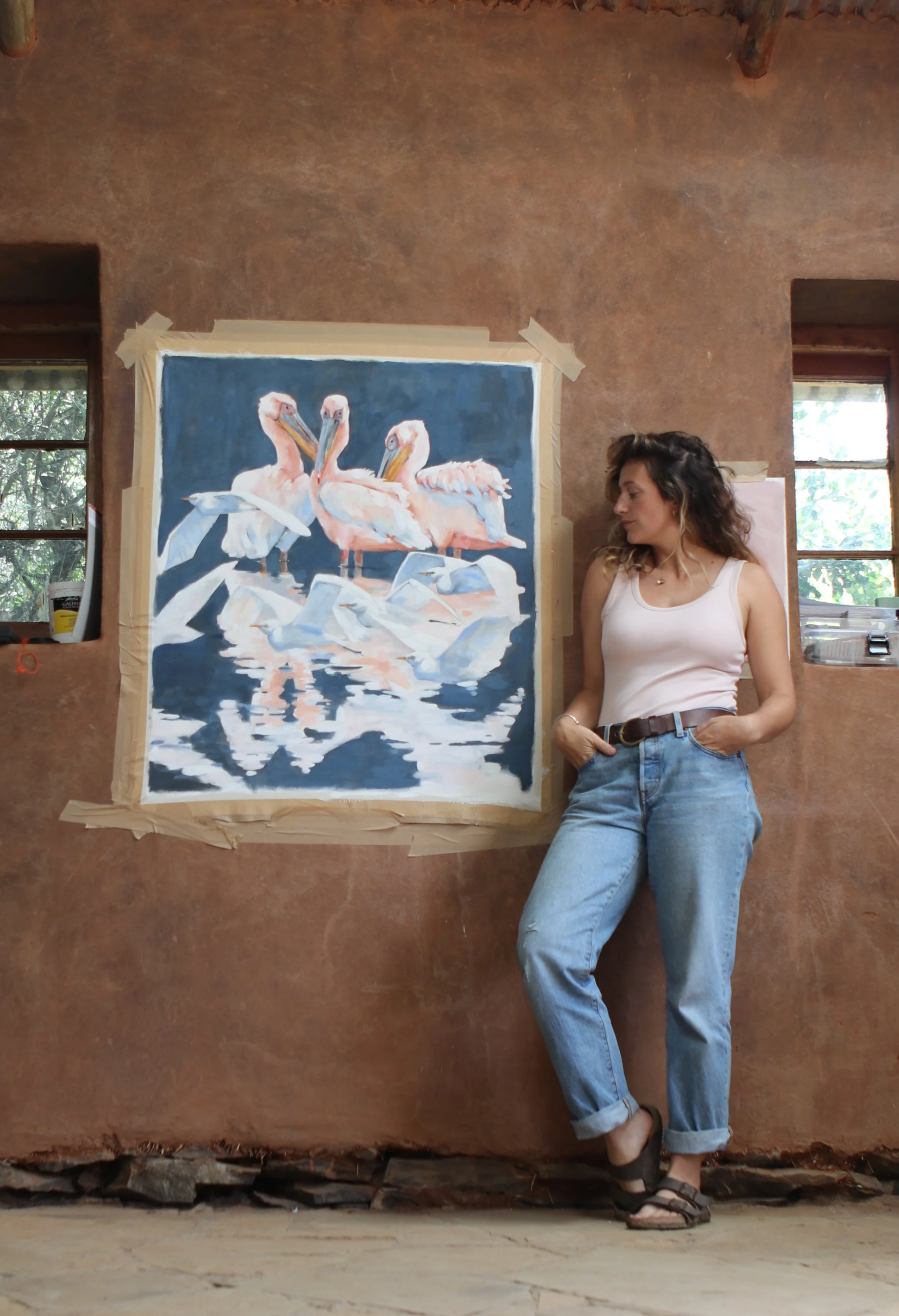 We followed a lioness and large male lion to the dam to drink. After they moved off into the thick scrub we stayed for a sundowner, joining the Great White Pelicans which reflected beautifully in the water as the days light dimmed. As a flock of egrets flew past in the foreground, I knew what my next painting would be!